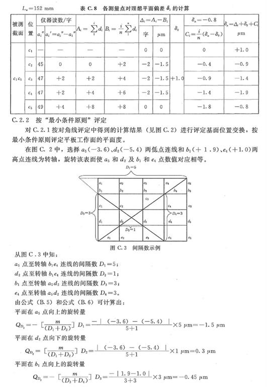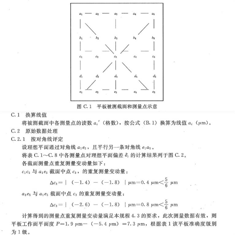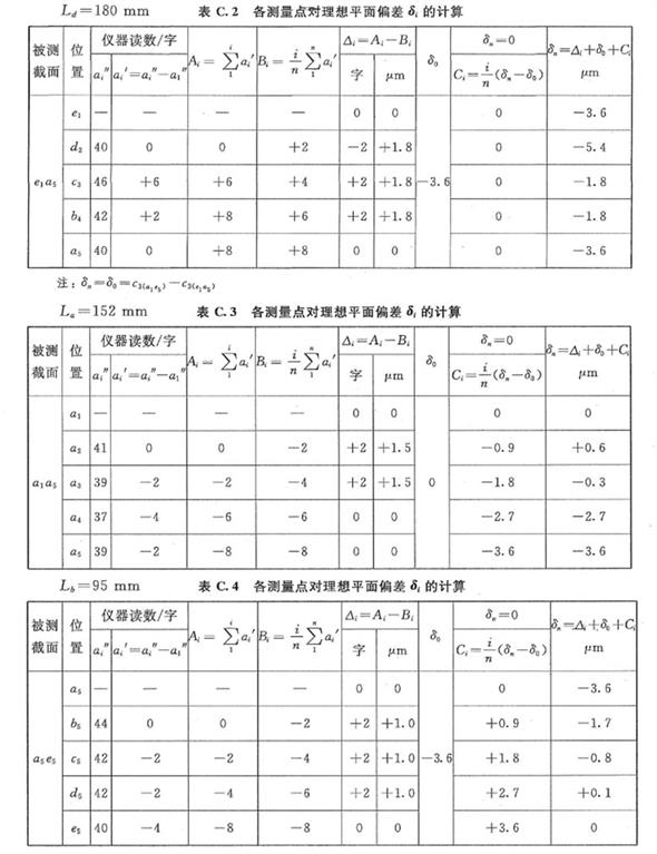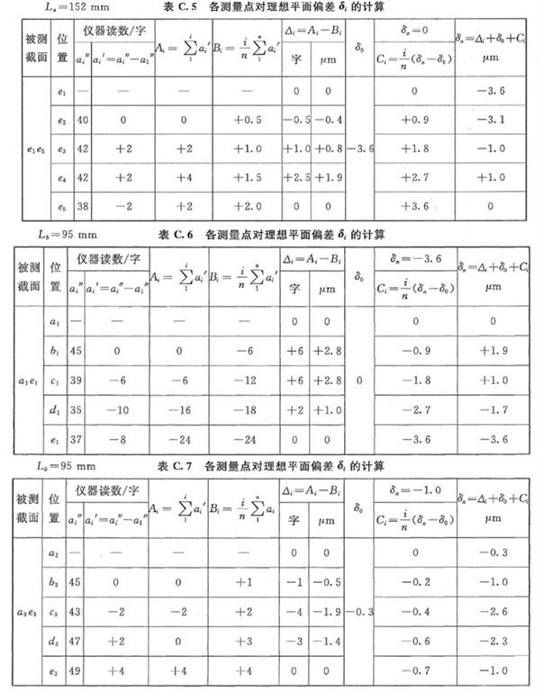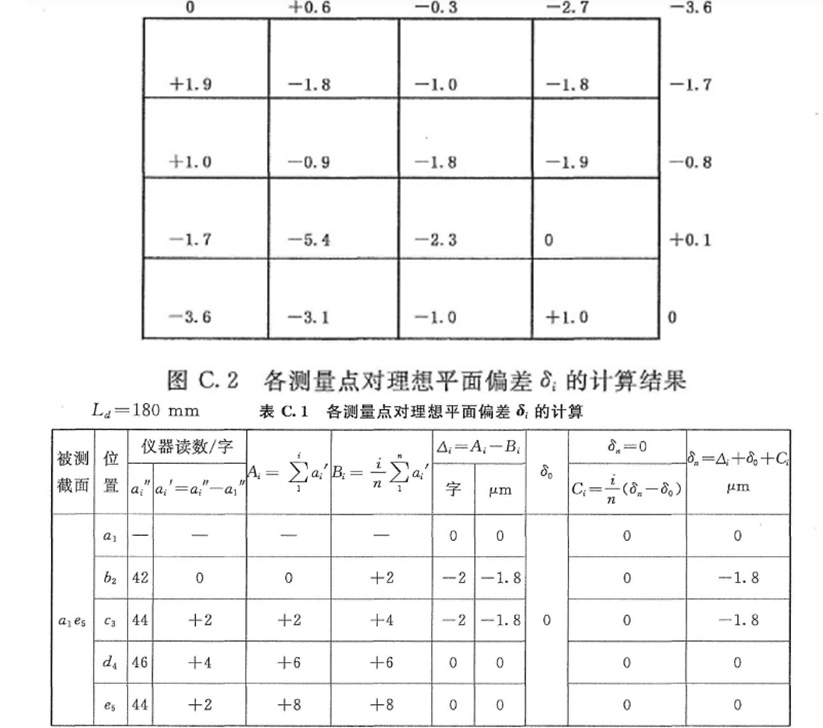 為例,主要用于說明平板工作面平面度的數據處理過程,以期對初學者有所幫助。平板被測截面和測量點如圖C.1所示。使用的橋板跨距分別為Ld=180mm,La=152mm,Lb=95mm,評定該